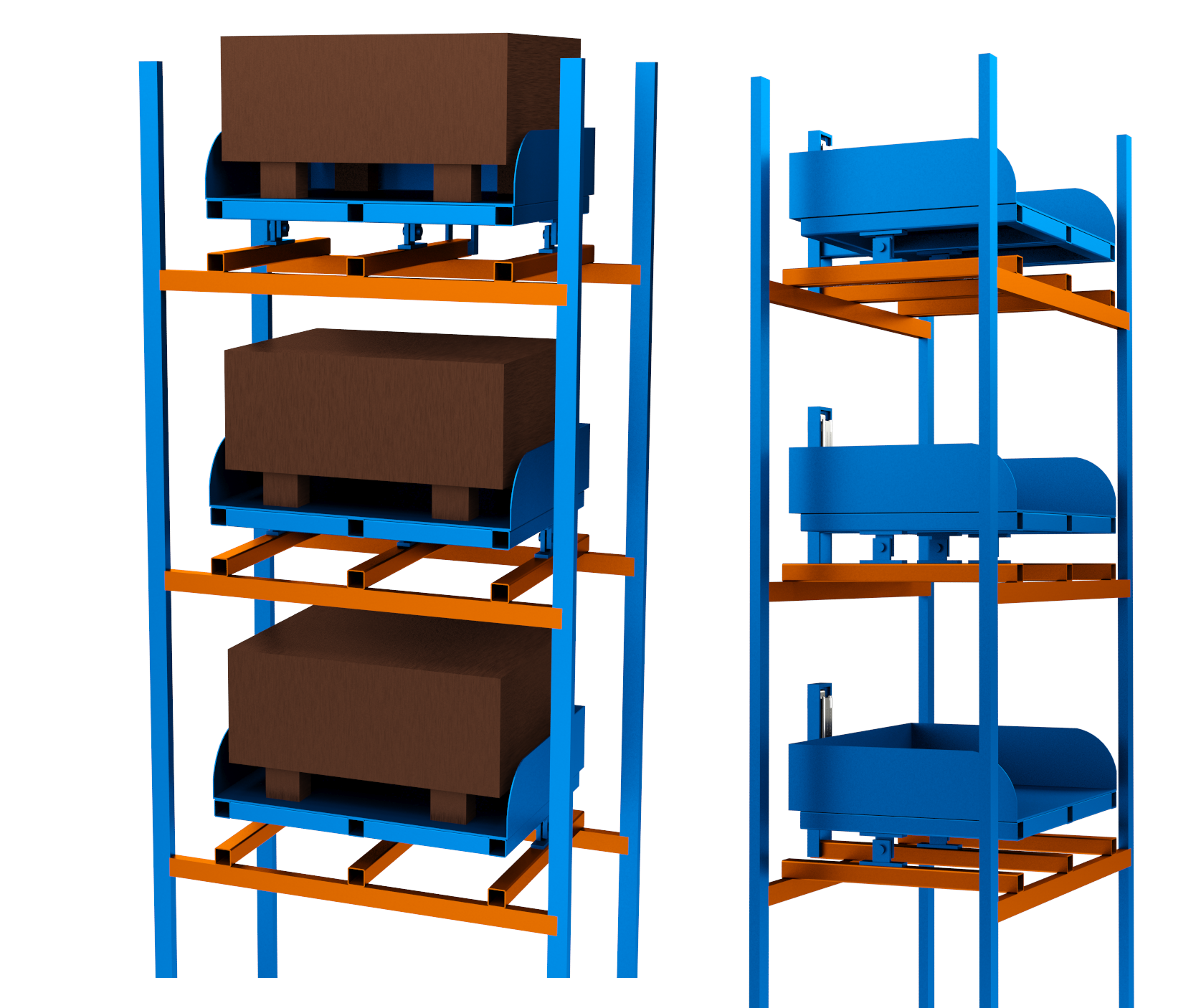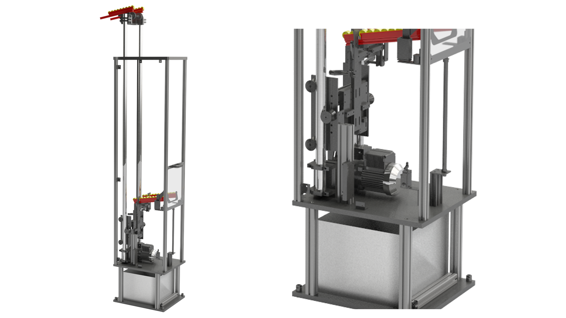 Bei dieser Ausführung eines Kleinaufzugs fährt das Transportgut in der Entladeposition automatisch aus. Diese Maschine kann sowohl senkrecht als auch schräg nach oben fahren, je nach den räumlichen Gegebenheiten. Sie kann mit, aber auch ohne Transportträger für das Transportgut eingesetzt werden. Die Hubhöhe ist an die Erfordernisse anpassbar.